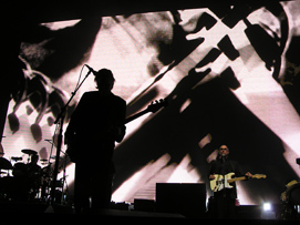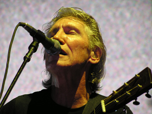 Without a verbal introduction, a gray-haired Waters appeared in sunglasses and a long black trench coat to sing "In the Flesh." A partially built wall of enormous white bricks stood on top of Waters' 240-foot stage. Throughout the course of the first set, the three-story barricade of 424 bricks was built by hard-to-see construction workers wearing only black. State-of-the-art lights, photos and movies were projected onto the 35-foot wall. One of The Wall's logos of two hammers was wrapped around Waters' sleeve. The same symbol stood the height of the massive round screen onstage. Soldiers marched along a bridge that connected the two sides of a wall under construction. Red lights illuminated thick fog, as fireworks shot towards the sky from the front of the stage. In the middle of the number, a military bomber looked like it was diving from the venue's ceiling onto the stage. Concluding the piece, a hail of bullets sprayed the talent. While helicopter search lights danced over the fortunate spectators on the floor during "The Thin Ice," photos were displayed of fallen soldiers and civilians from WWII, Iraq and 9-11.