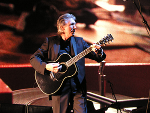 The boys dug into "In the Flesh," and a gigantic balloon of a black boar that read "Trust Us" floated around the arena. The inflatable prop reminded many audience members of the "Impeach Bush Now" pig seen on Waters' 2007 Dark Side tour. Bright red, blue and yellow searchlights danced around the inflated animal. By the time the crowd heard "The Show Must Go On," animated fighter jets fighter planes were flying across the screen and dropped crosses in the place of bombs. Meanwhile, thousands of 2-inch paper versions of stars, dollar signs and seashells fell over the fortunate audience members on the floor. The unparalleled highlight of the evening was "Run Like Hell." Throughout the intense anthem, Waters acted as if he were a fascist dictator in the spotlight before an angry mob. During the clean guitar intro, he burst with maniacal laughter and shot an imaginary machine gun into the crowd. The screen displayed random words as applications, like iLearn and iPlanet, as Waters' silhouette covered optical illusions and trippy images racing across the wall.